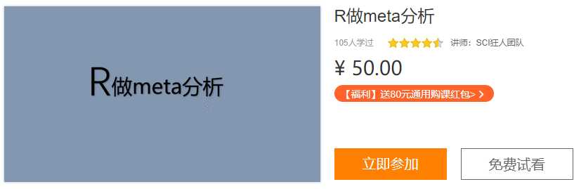 R做meta分析课时1视频课程介绍07:35可试看课时2视频R的安装07:33课时3视频二分类变量数据的准备与绘制森林图24:48课时4视频亚组分析16:07课时5视频敏感性分析08:13课时6视频检测发表偏倚15:49课时7视频连续性变量数据的准备与绘制森林图19:49课时8视频meta回归适用人群医学本科生、研究生、博士、临床医生、循证医学研究人员...