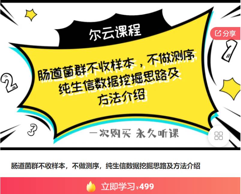 肠道菌群不收样本,不做测序,纯生信数据挖掘思路及方法介绍499r课程目录01.菌群研究基本概念及方法mp402.16s测序的生信数据挖掘思路和示例.mp403.宏基因组测序的生信数据挖掘思路和示例.mp404.多组学整合测序的生信数据挖掘思路和示例.mp405.肿瘤微环境中存在的菌群挖掘思路.mp4肠道菌群为近年来的持续热点,特别是可以通过...