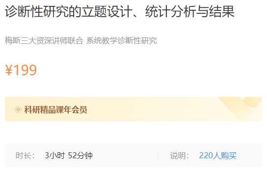 诊断性研究的立题设计、统计分析与结果梅花斯笔记M16-199第1章 诊断性研究的立题与设计第1节 诊断性研究的立题与设计概要-100:12:00第2节 诊断性研究的立题与设计概要-200:15:35第3节 诊断性研究设计要点和分析思路(上)00:24:51第4节 诊断性研究设计要点和分析思路(下)00:34:51第2章 诊断性研究...