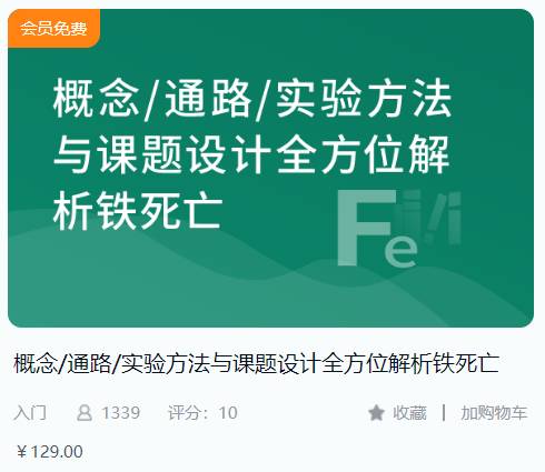 概念/通路/实验方法与课题设计全方位解析铁死亡129r课程目录1 前言 (00:16:58)2 第一章铁死亡主要防御通路 (00:44:03)3 第一章铁死亡三要素及其涉及到通路 (00:32:41)4 第一章铁死亡核心概 (00:23:03)5 第二章铁死亡与自噬 (00:25:24)6 第二章-铁死亡与代谢 (00:21:40)7 第二章铁死亡与癌症 (00:42:12)8 第三...