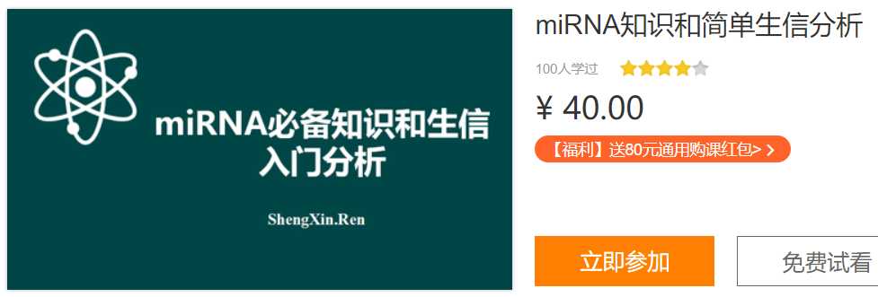 miRNA知识和简单生信分析目录40 章节1:miRNA讲解视频试看 课时1视频miRNA必备知识讲解09:50可试看 课时2视频miRNA常用分析软件10:36 课时3视频miRNA数据分析流程12:58 课时4视频miRNA靶基因预测...